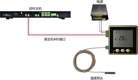 1.溫度傳感器上有DC12V、RS485①、開關量輸入、溫度傳感器,有4個接口。