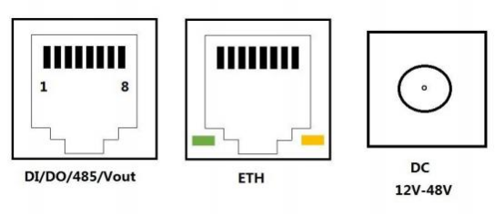 設備下方有3個接口: DI/ DO/485/Vout 接口、ETH 網絡通訊接口、DC12V-48V。