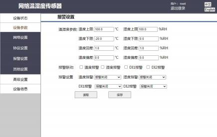 用戶在該頁面可以設置溫度、濕度上下限報警閾值、報警回差值,用戶可以自由選擇是否開啟報警以及報警觸發條件,同時在該頁面用戶可以選擇報警是否需要聯動繼電器,如果選擇聯動,那么報警觸發時,繼電器將會工作。
